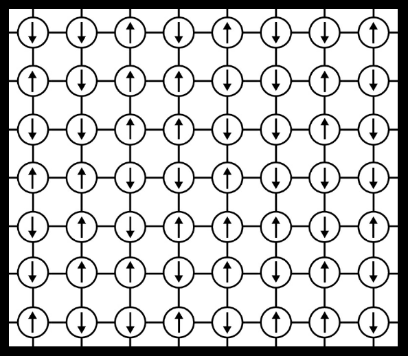 Però l’analogia és que el material magnèticament es desordena i no hi ha una periodicitat en l’orientació dels spins magnètics: uns cap amunt, uns cap avall, i és tot desordenat, com un sistema amorf, són sistemes amorfs magnètics, és la variable de l’emanació local de cada àtom que apunta en una direcció totalment aleatòria, no hi ha ordre magnètic, això és el que és un vidre d’espí.